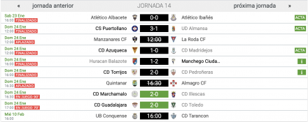 Con CF La Solana y CD Villacañas con jornada de descanso, los equipos llegaron a la cita con la ilusión de seguir sumando en su casillero particular. Para esta décimo cuarta jornada, cabe destacar el aplazamiento de hasta tres partidos: UB Conquense – CD Tarancón, Quintanar – Almagro y Manzanares – La Roda.