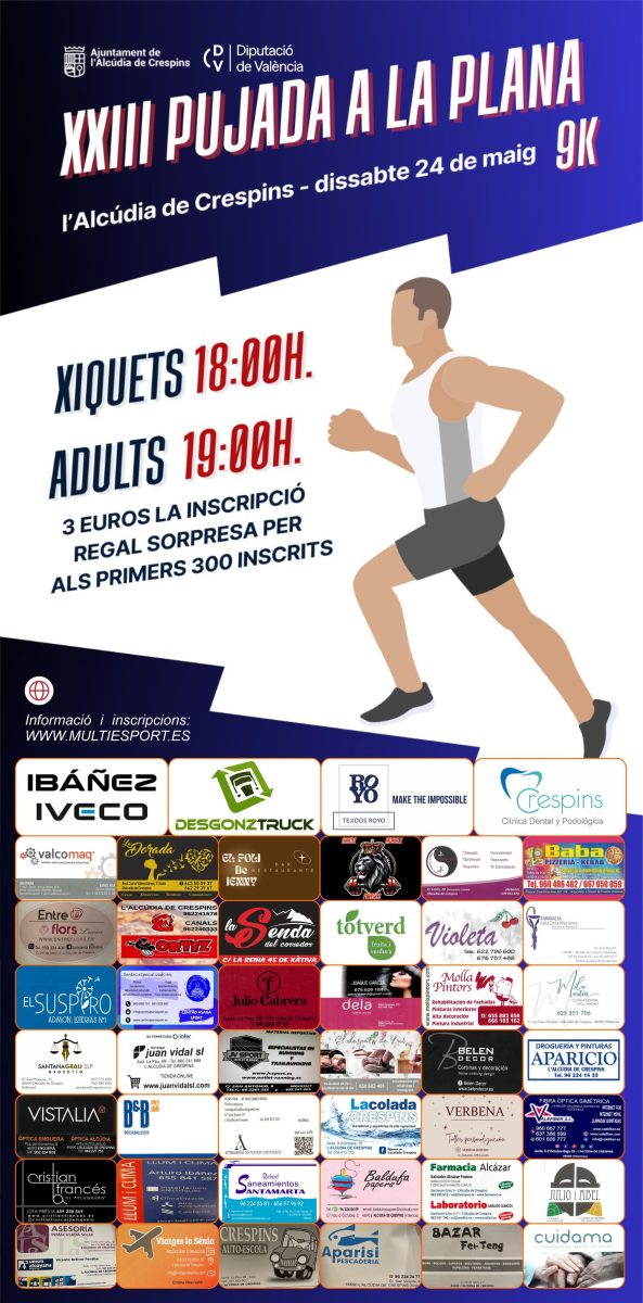 El próximo sábado 24 de mayo se celebra la XXIII Subida a la Plana de l´Alcúdia de Crespins. Desde la organización se informa: «Este año, y como novedad en este tipo de competición, contamos con varios premios materiales y en metálico gracias a la colaboración de patrocinadores. Especialmente Royo, Ibáñez Talleres, Desgonztruck y Clínica Dental Crespins».