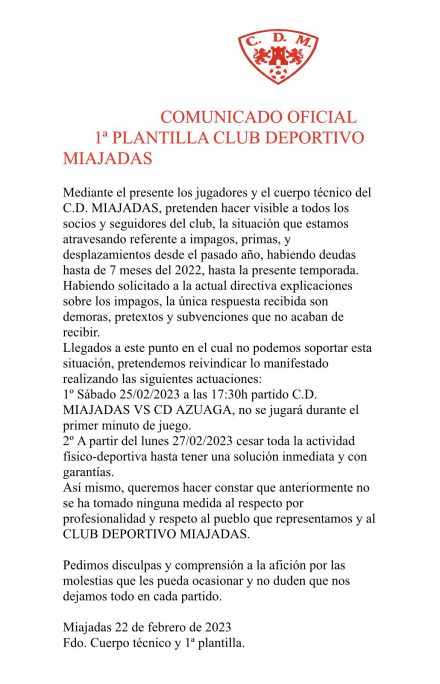 Los integrantes del primer plantel del Miajadas afirman que existen deudas «hasta de siete meses del 2022 hasta la actualidad«. Una vez demandan soluciones al club, la directiva les emplaza a retrasos en las subvenciones. Así pues, en el encuentro de este fin de semana ante el CD Azuaga, los jugadores titulares no disputarán el primer minuto a modo de protesta.