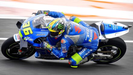 Joan Mir pilotando la Suzuki durante el GP de Europa en Valencia.